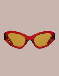 Oversized and upswept wrap-around frame in a semi-transparent Oxblood. Brown tinted lenses. Bespoke wavy temple shape with an embedded silver logo. Ribbed inner tip grips. Handcrafted from bio-circular acetate from recycled plastics. Five barrel hinges with coated safety screws. Complete with lens cloth and collapsible pyramid case. Lens cloth made with 100% recycled PET microfiber with custom artwork. Pyramid case made with 100% recycled leather-like PET black case with plush flocked lining and embossed custom branding. Produced in China.