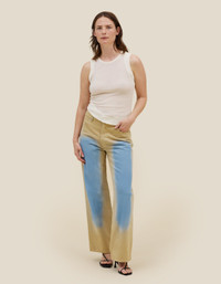 These high-rise, wide-leg jeans are made from 100% cotton 14oz denim, indigo stripped and overdyeed tan with soft blue spray on the front and back legs, featuring signature EL back pockets; the inseam is 30" for sizes 24–29 and 32" for sizes 30–36. Hazem is 6'2 and wears a size 30, Georgia is 5'10 and wears a size 27 100% COTTON Produced in USA