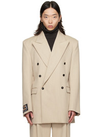 Virgin wool canvas blazer. · Peaked lapel · Double-breasted button closure · Flap pockets at front · Padded shoulders · Logo patch at cuff · Surgeon's cuffs · Button strap at back · Central vent at back hem · Welt pockets at interior · Full satin lining Supplier color: Beige Body: 100% virgin wool. Trim: 100% cotton. Lining: 100% viscose. Made in Hungary 252830M195005