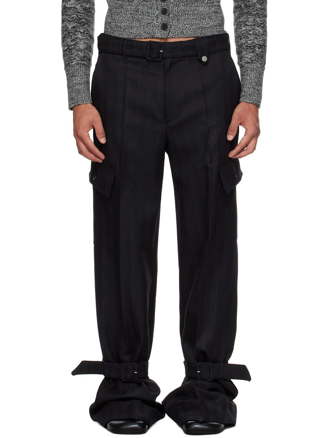 Virgin wool herringbone cargo pants. · Belt loops and detachable pin-buckle belt at waistband · Four-pocket styling · Zip fly · Pin-buckle strap at legs · Cargo pocket at outseams Supplier color: Black Body: 100% virgin wool. Trim: 100% cotton. Made in Hungary 252830M191012