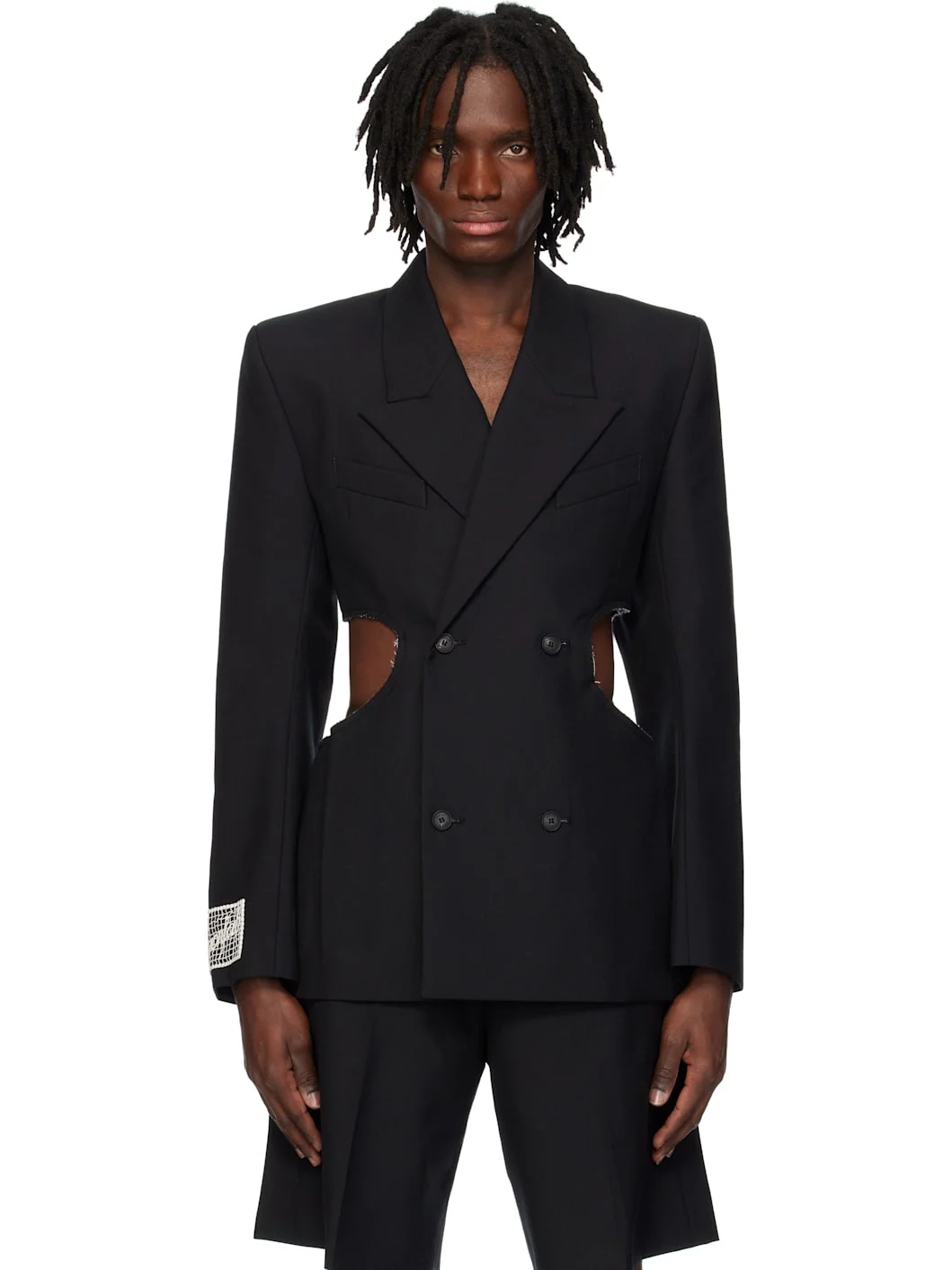 Wool twill blazer. · Peaked lapel · Double-breasted button closure · Welt pockets at chest · Darts at front · Cutouts with raw edges at waist and elbows · Padded shoulders · Surgeon's cuffs · Embroidered logo patch at cuff · Central vent at back hem · Full logo-woven satin lining Supplier color: Tailoring black wool Body: 100% wool. Lining 1: 100% viscose. Lining 2: 100% cotton. Made in Hungary 251830M195001