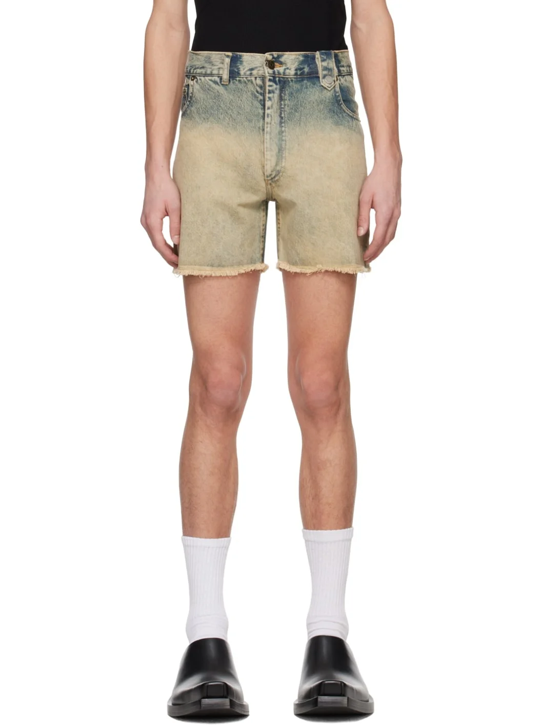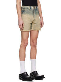 Non-stretch denim shorts. Fading throughout. · Belt loops · Five-pocket styling · Zip-fly · Press-stud tab at front waistband · Frayed edge at cuffs · Logo patch at back waistband · Contrast stitching in tan Supplier color: Champagne stonewashed 100% cotton. Made in Serbia 241830M193007