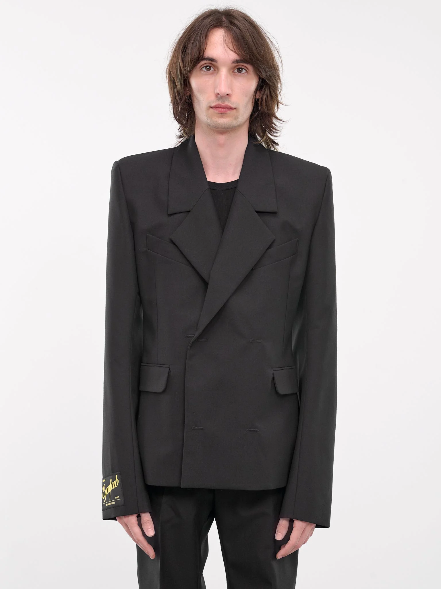 EGONLAB black jacket, blazer design, notched lapel collar, padded shoulders, tonal button closure & cuffs, chest & interior welt pockets, side flap pockets, back central vent, fully lined, waist length, boxy fit. Made in Hungary Body - 100% Wool Lining - 100% Cupro European Sizing Model is 6’0” wearing size 48. Shoulders: 19" Chest: 38” Waist: 30”