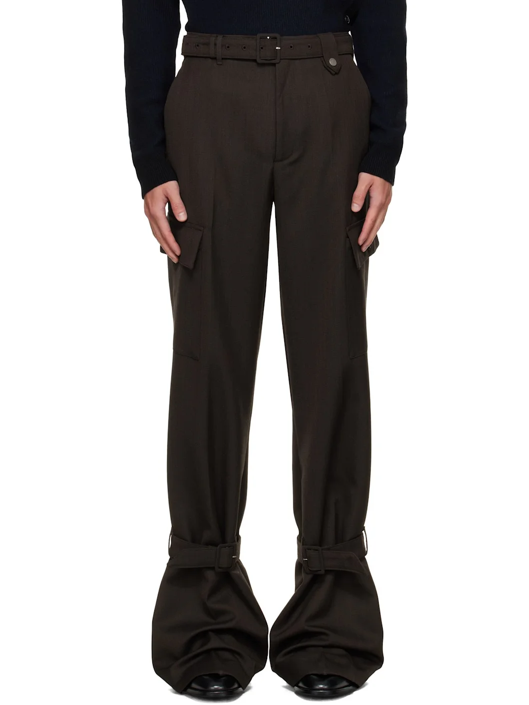Virgin wool canvas trousers. · Belt loops and detachable pin-buckle belt at waistband · Four-pocket styling · Zip fly · Cargo pocket at outseams · Pin-buckle strap at legs Supplier color: Brown Body: 100% virgin wool. Trim: 100% cotton. Made in Hungary 252830M191004