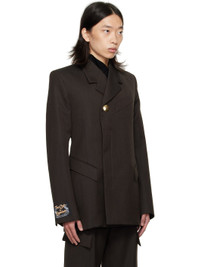 Virgin wool canvas blazer. · Notched lapel · Concealed button closure · Welt pocket at chest · Flap pockets at front · Padded shoulders · Logo patch at cuff · Surgeon's cuffs · Central vent at back hem · Full satin lining Supplier color: Brown Body: 100% virgin wool. Trim: 100% cotton. Lining: 100% viscose. Made in Hungary 252830M195002