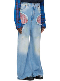 Non-stretch denim jeans. Fading and distressing throughout. · Belt loops · Logo-engraved press-stud tab at front · Five-pocket styling · Zip-fly · Raw-edge cutout with exposed lining at outseams · Leather logo patch at back waistband · Partial cotton flannel lining · Logo-engraved gunmetal-tone hardware · Contrast stitching in tan Available exclusively at SSENSE. Supplier color: Dirty blue 100% cotton. Made in Tunisia 251830M186019