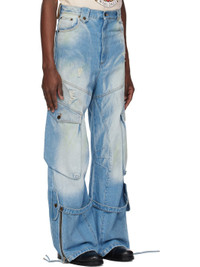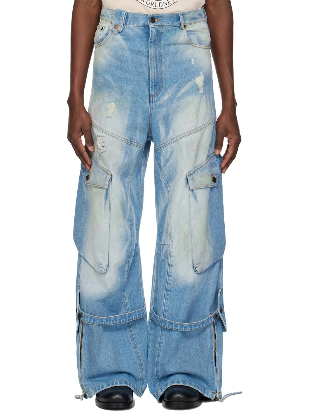Wide-leg non-stretch denim cargo pants. Fading, subtle paint splatter, and smudging throughout. · Belt loops · Five-pocket styling · Zip fly · Adjustable button strap at legs · Zip expansion panel at cuffs · Cargo pocket at outseams · Logo patch at back waistband · Contrast stitching in tan Available exclusively at SSENSE. Supplier color: Blue dirty 100% cotton. Made in Tunisia 251830M188002