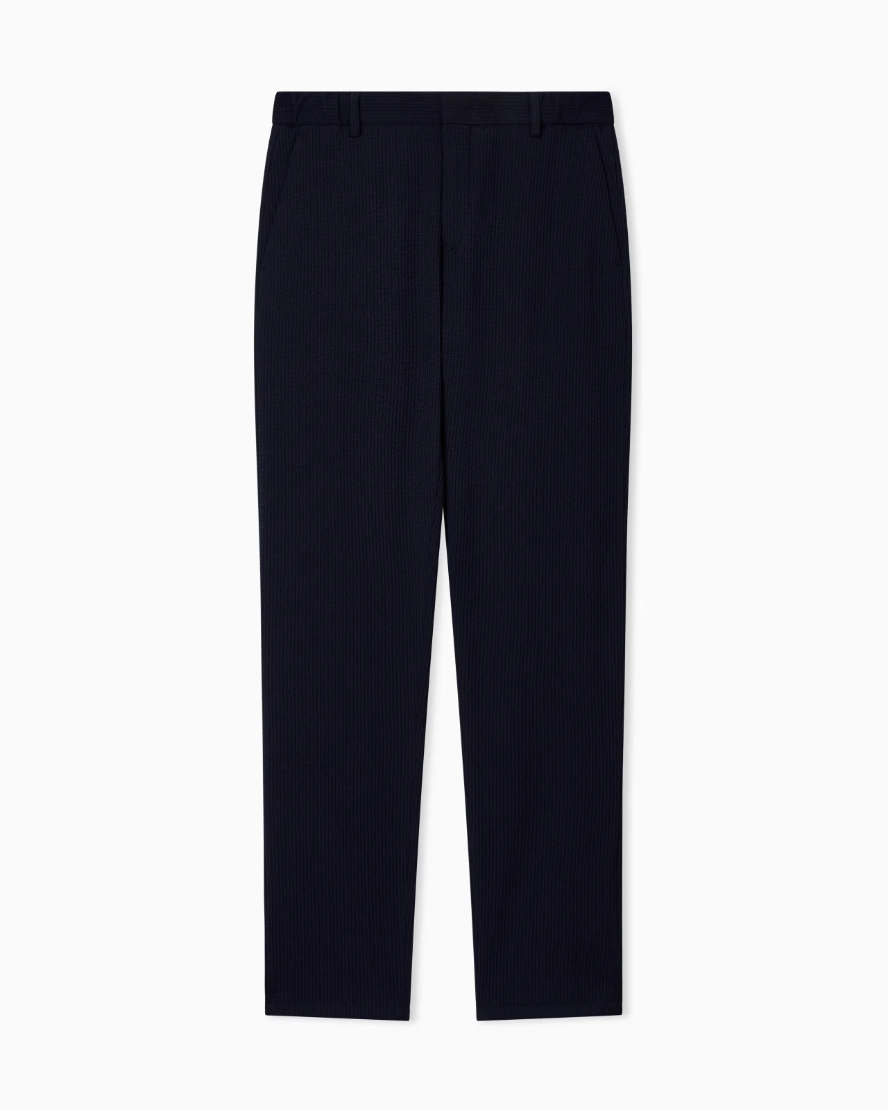 Trousers made of virgin-wool stretch-jersey with an exclusive three-dimensional embossed waffle effect. A garment that stands out for its refined lines and texture. Ankle cuffs: 19 cm Stretch jersey 3D waffle effect Waist with belt loops Zip and hook closure Side pockets Buttoned back welt pockets Product Code: EM001761TE18695UB109