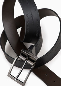 This reversible belt features smooth leather on the outer side and embossed, all-over, Emporio Armani lettering on the inner side, so you can choose which colour and pattern to wear based on your look. Product Code: Y4S426YTU5J188044 Details Composition 100% Bovine leather Measurements: 125 x 3.5 cm Leather Reversible One smooth side One side with all-over logo lettering Metal buckle Made in Italy