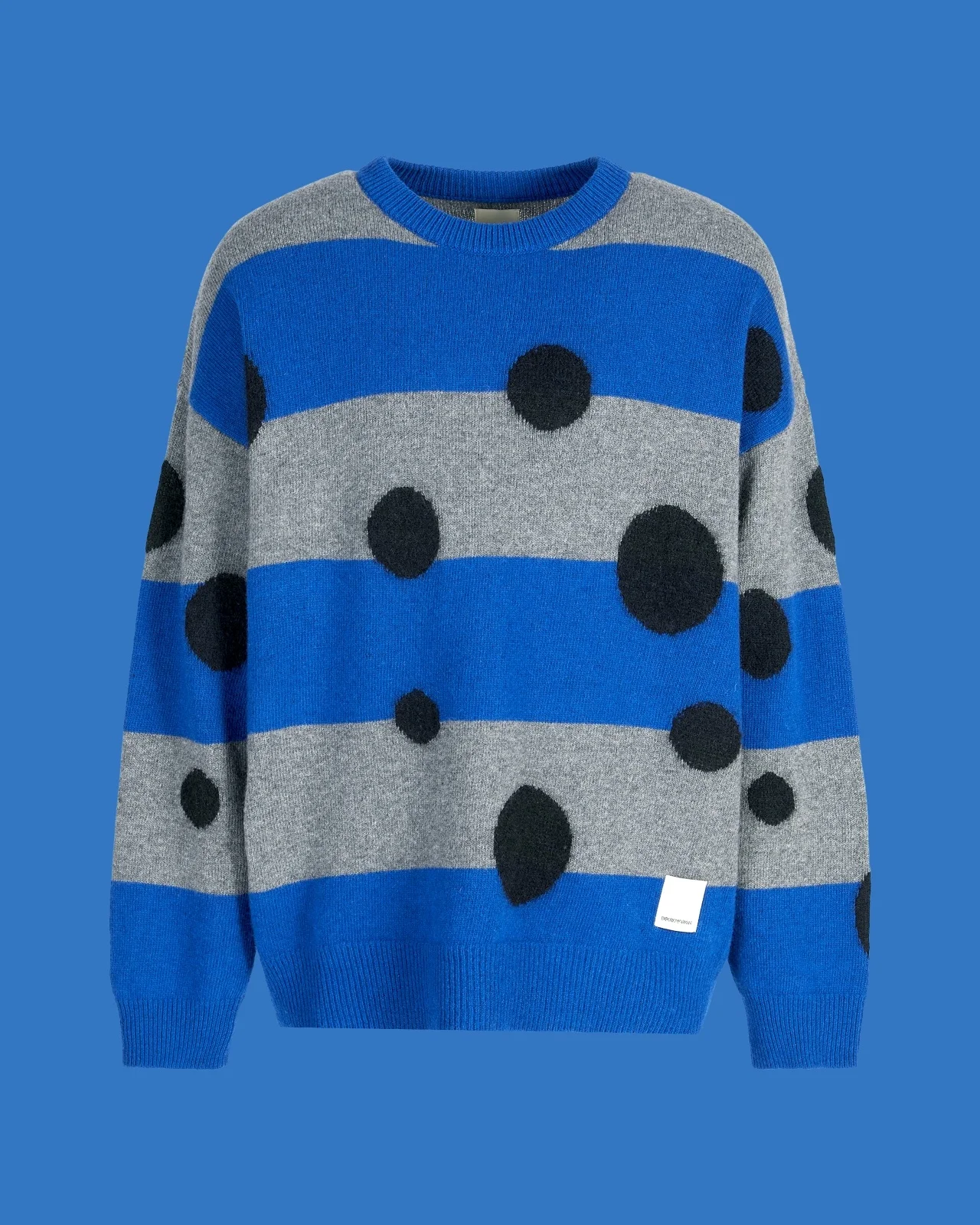 Wool-blend crew-neck jumper with an all-over polka-dot and striped jacquard motif. Emporio Armani maintains its focus on sustainability with the new Armani Sustainability Values (ASV) capsule collection, highlighting the need for a supply chain that is responsible and attentive to the resources of our planet. Named Black Blue, this futuristic collection takes us to a colour dimension that evokes distant, uncharted planets. The alternation of two key colours, blue and black, explodes in the Cosmos print, giving the entire collection a modern feel. The clothing is defined by atypical contrasting shapes: sometimes oversized for exceptional comfort and freedom of movement, and sometimes super skinny to enhance the silhouette with ultra-elongated lines. Hints of feminine colour harmoniously complete the blue-black pairing. The fabric is made from 35% recycled wool Fineness: 7 Wool Jacquard Crew neck Long sleeves Rib-knit cuffs and hem Product Code: 6D1MZ11MH1ZF941