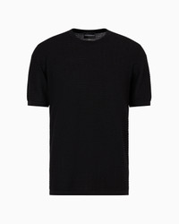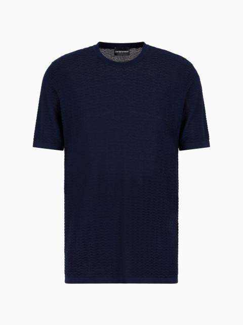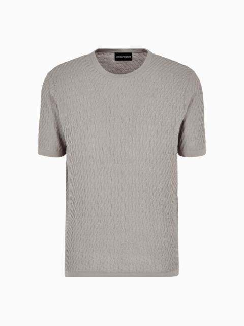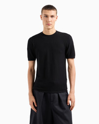 Crew-neck, short-sleeved jumper made from a Lyocell blend, a semi-synthetic fibre that has an exceptionally low impact on the environment. It is produced from eucalyptus leaves and is valued for being moisture-wicking, durable, breathable and wrinkle-proof. The particularly lightweight patterned knit showcases an exclusive embossed motif. Product Code: 6D1MY31MF2Z10999 Details Composition 50% Acrylic 30% Lyocell 20% Wool Fineness: 14 Patterned knit Crew neck Short sleeves Finished edges Fitting The model is 188 cm tall and is wearing size 48/M (Italian Size)