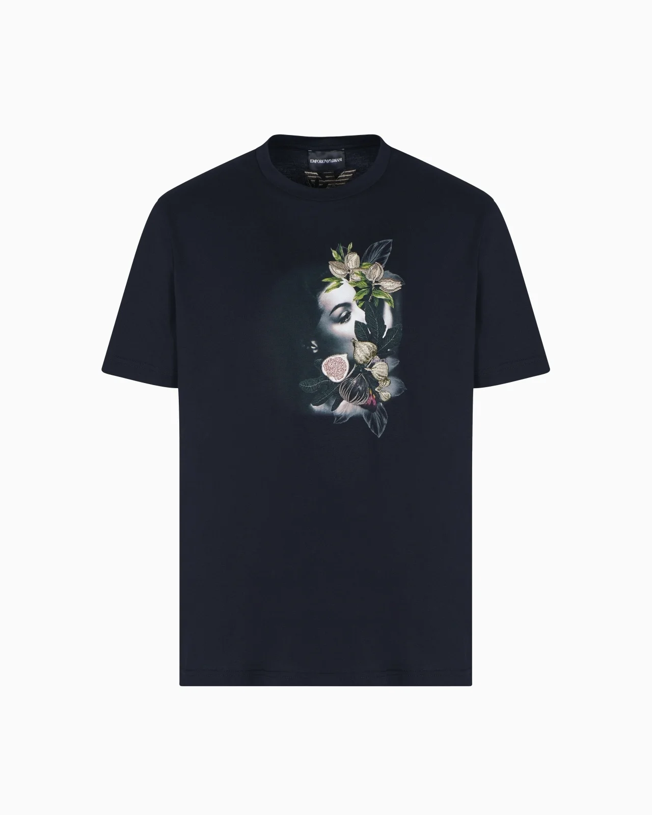 Crew-neck T-shirt in cotton jersey, embellished on the front with a mix of prints, depicting elegant retro outlines of a woman with blurred contours, and an embroidery featuring figs and foliage, a still life that elegantly elevates a garment suitable for both casual and more formal occasions. Jersey Crew neck Collection print and embroidery Embroidery on the back Short sleeves Product Code: EM003480AF19418UC001