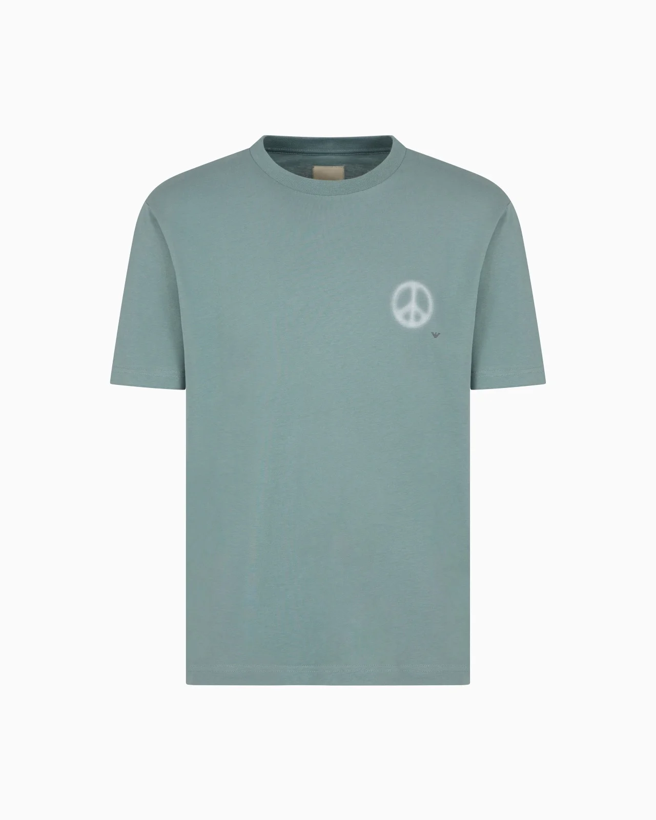 Pure cotton-jersey, crew-neck T-shirt. The collection print adorns the item on both the chest and back, completing it with style. This season’s Armani Sustainable Values (ASV) capsule collection draws inspiration from the feeling and profound, universal meaning of PEACE. The keyword that connects the entire collection is expressed in all its forms, enhancing simplicity, harmony and the eternal link between mankind and nature, offering a wardrobe composed of practical, comfortable and highly versatile daywear pieces designed to accompany us seamlessly throughout the day. Smooth, sometimes shiny surfaces merge with floral jacquard motifs and all-over prints depicting the symbol of peace. Fabric: at least 70% organically grown cotton Jersey Crew neck Short sleeves Collection print Back logo patch Product Code: EM001717AF14836F9048
