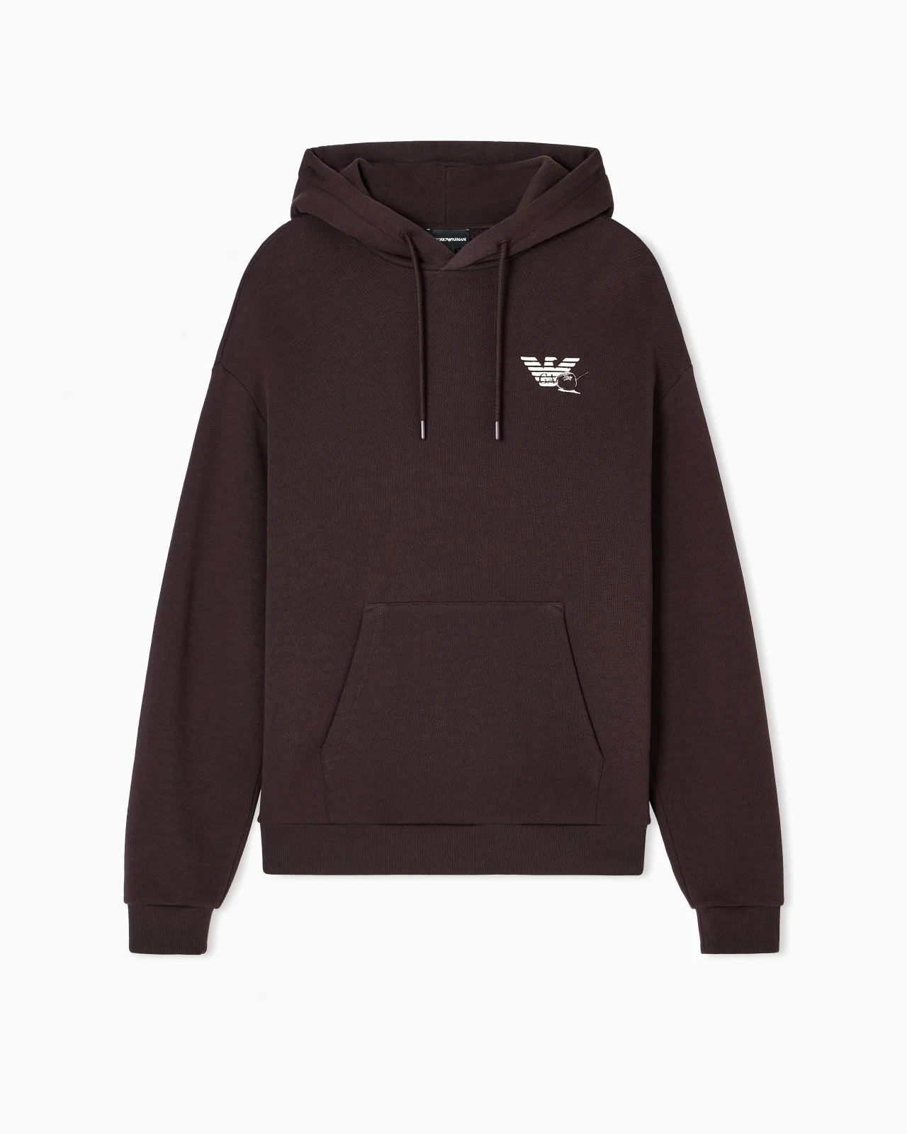 Sweatshirt with drawstring hood and front pouch pocket. The embroidery and decorative prints elegantly embellish a piece that is created for casual looks but adapts perfectly to even the most sophisticated occasions: eagle embroidery on the chest and an oversized collection print with shiny finish details on the back. Jersey Twill weave Drawstring hood Eagle embroidery Long sleeves Pouch pocket Collection print on the back Product Code: EM003611AF14793U6032