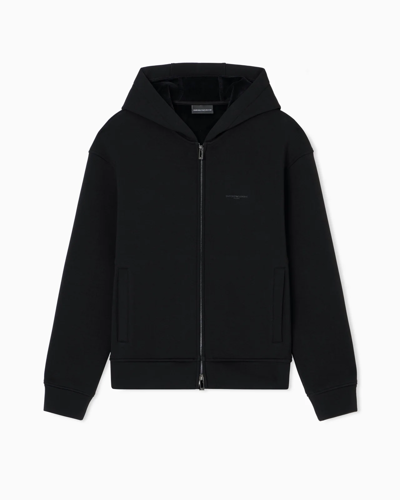 Zip-up sweatshirt with hood made of fabric bonded with cosy jersey on the outside and warm, plush chenille on the inside. The micro logo lettering on the chest with a rubberised finish makes the piece understated. Jersey Hood Front zip Rubberised logo Long sleeves Side pockets Chenille interior Product Code: EM002866AF17547UC001