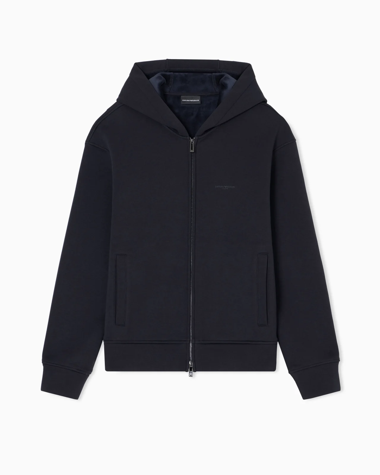 Zip-up sweatshirt with hood made of fabric bonded with cosy jersey on the outside and warm, plush chenille on the inside. The micro logo lettering on the chest with a rubberised finish makes the piece understated. Jersey Hood Front zip Rubberised logo Long sleeves Side pockets Chenille interior Product Code: EM002866AF17547UB118
