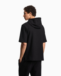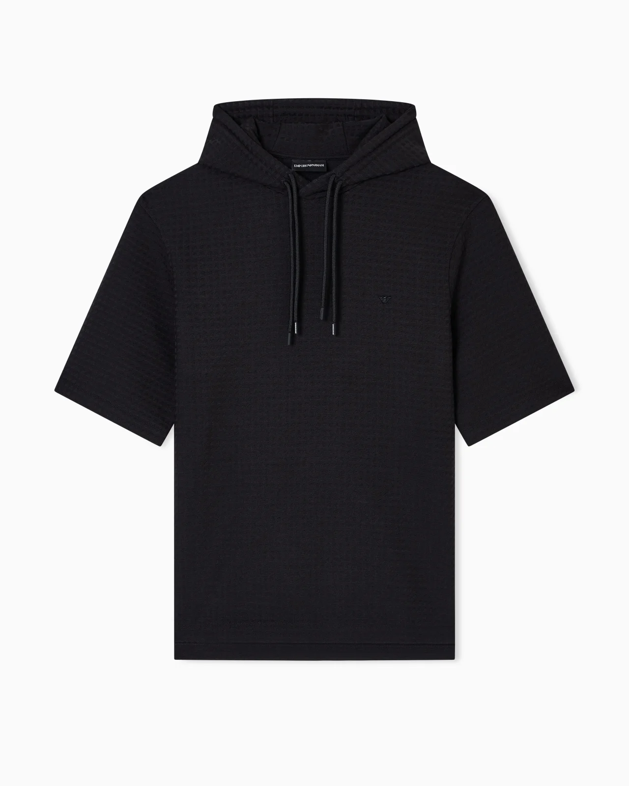 Short-sleeved sweatshirt with drawstring hood. Made from Lyocell-blend jersey. Lyocell is a semi-synthetic fibre that has an exceptionally low impact on the environment. It is derived from eucalyptus trees and is renowned for being very durable, breathable, absorbent and wrinkle-proof. The jacquard pattern creates an original all-over motif, adding prestige and personality to the style. This refined style can be worn anywhere and with anything. Jersey Jacquard Drawstring hood Short sleeves Micro-eagle embroidery on the chest Product Code: EM003143AF13700FC231