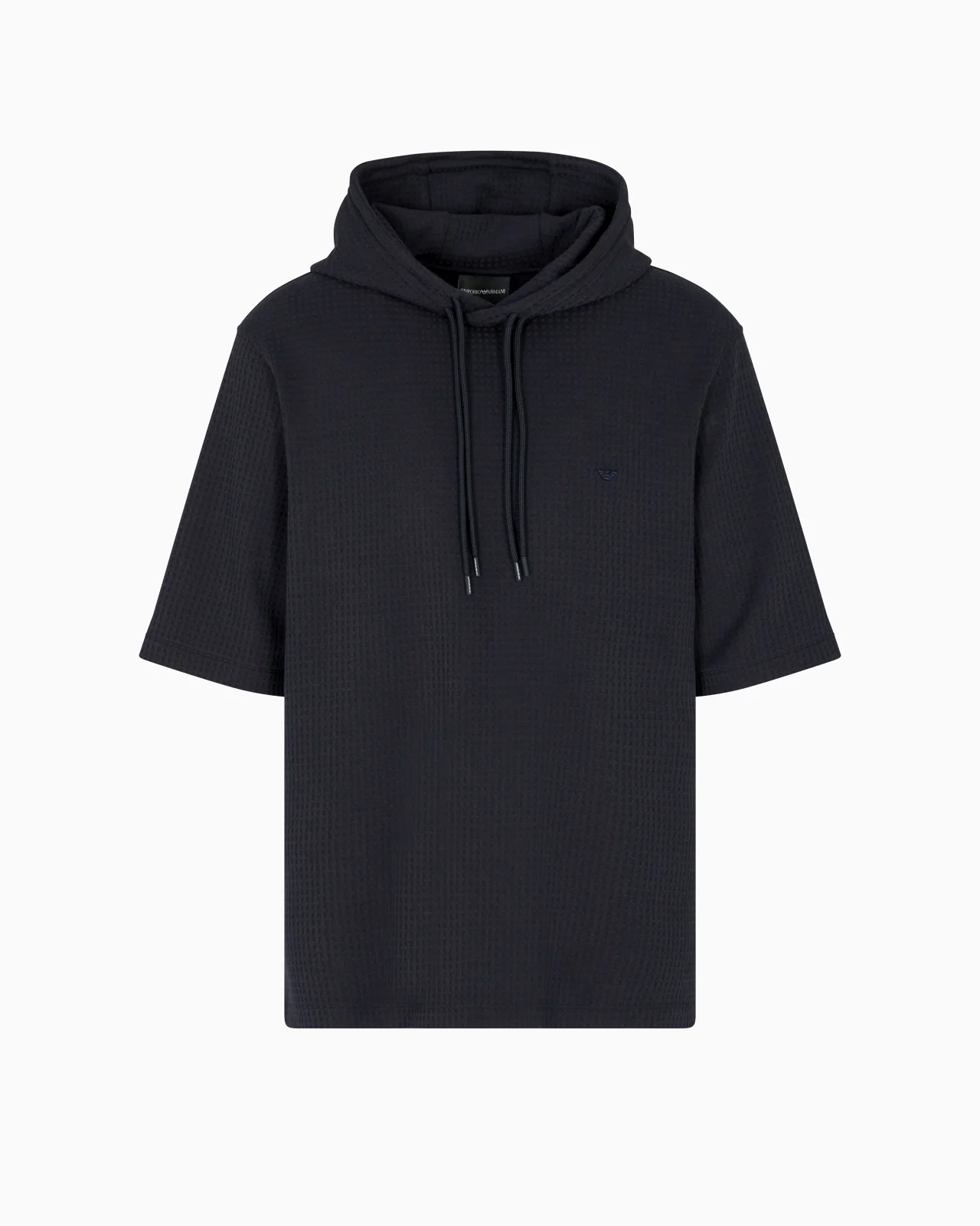 Short-sleeved sweatshirt with drawstring hood. Made from Lyocell-blend jersey. Lyocell is a semi-synthetic fibre that has an exceptionally low impact on the environment. It is derived from eucalyptus trees and is renowned for being very durable, breathable, absorbent and wrinkle-proof. The jacquard pattern creates an original all-over motif, adding prestige and personality to the style. This refined style can be worn anywhere and with anything. Jersey Jacquard Drawstring hood Short sleeves Micro-eagle embroidery on the chest Product Code: EM003143AF13700FB297