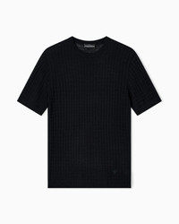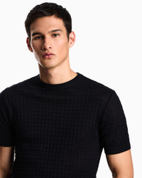 Short-sleeved, crew-neck jumper in a plain and purl knit, creating a check-like op-art texture. Made in a wool and Lyocell blend. Lyocell is a semi-synthetic fibre that has an exceptionally low impact on the environment. It is derived from eucalyptus trees and is renowned for being very durable, breathable, absorbent and wrinkle-proof. Fineness: 12 Crew neck Front and back plain knit Short sleeves Ribbed trim Product Code: EM003504AF14113UB109