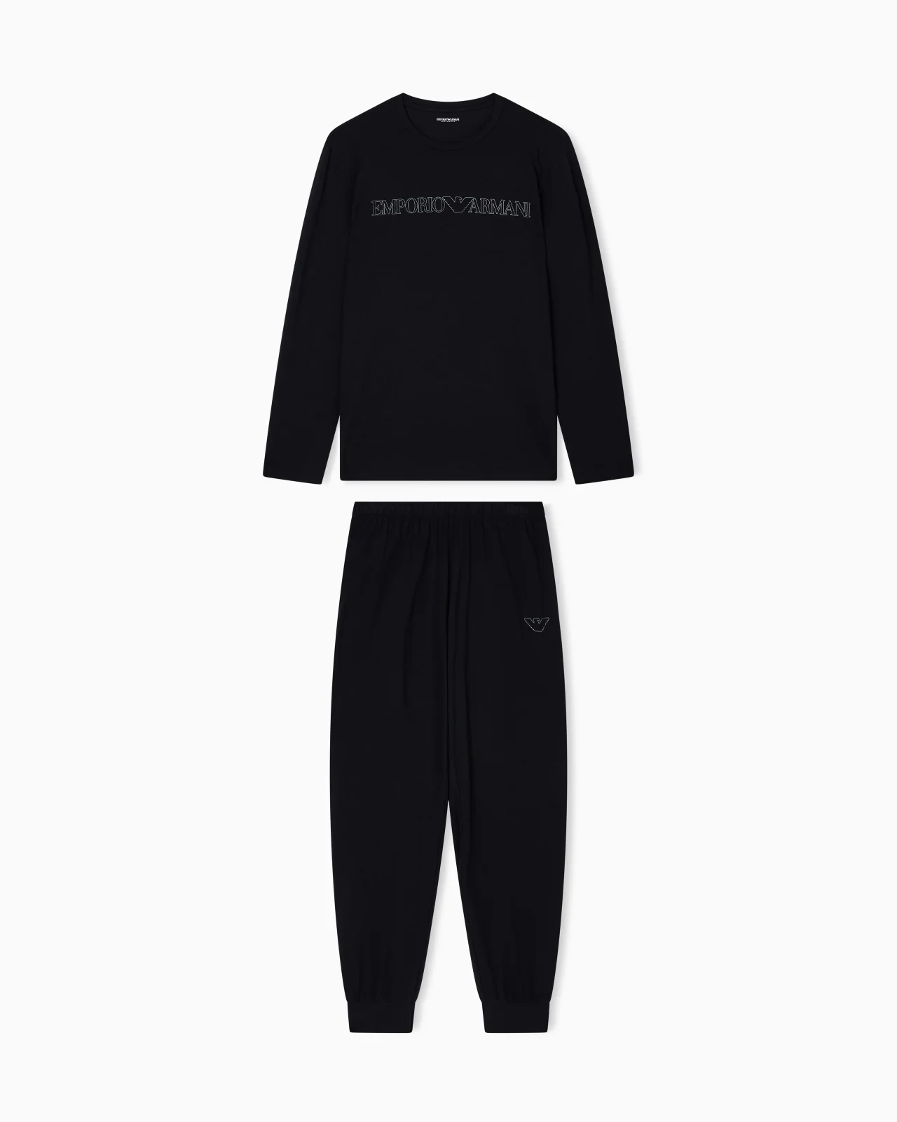 Stretch cotton jersey pyjamas made of natural fibres from organic farming. Consisting of a crew-neck top, along with trousers featuring an elasticated waist. Oversized decorative front logo. Fabric: 95% organically grown cotton Stretch jersey Crew-neck jumper Logo print Trousers with elasticated waist Side pockets Elasticated hem Product Code: EM000616AF14978UC001