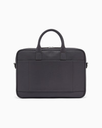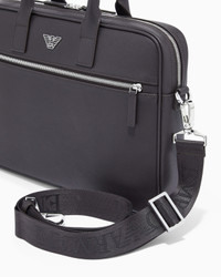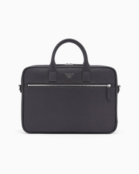 Briefcase made of regenerated leather from certified recycled material, with practical, removable webbing shoulder strap and double rigid handle. Every product made from regenerated leather is the result of an eco-sustainable process that re-purposes left-over leather, processed and assembled without using any adhesive whatsoever and very conscious of water conservation.Not wasting resources helps to make this leather an environmentally friendly material, yet it retains the same qualities of real leather, both to the eye and to the touch. A collection of accessories created to satisfy the requirements of the Emporio Armani man who demands stylish, work-ready looks. The essential, alluring design features a Saffiano-print finish and is customised with a shaped, perforated metal eagle logo. The material is made of 51% regenerated leather Measurements: 37A xA 25A xA 6A cm Regenerated leather Saffiano leather Eagle plate Double rigid handle Zip closure Front zip pocket Removable logo shoulder strap Trolley suitcase support strap Product Code: Y4P119Y138EUB104