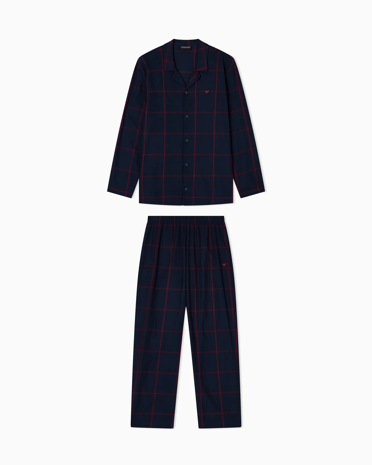 Pyjamas in a cotton and viscose blend flannel with a classic tartan motif, consisting of a top with lapels and matching elasticated-waist trousers. Eagle logo on both pieces. Flannel Tartan motif 2-piece pyjamas Top with lapels Front buttoning Trousers with elasticated waist Micro eagle Product Code: EM000615AF15008MB345