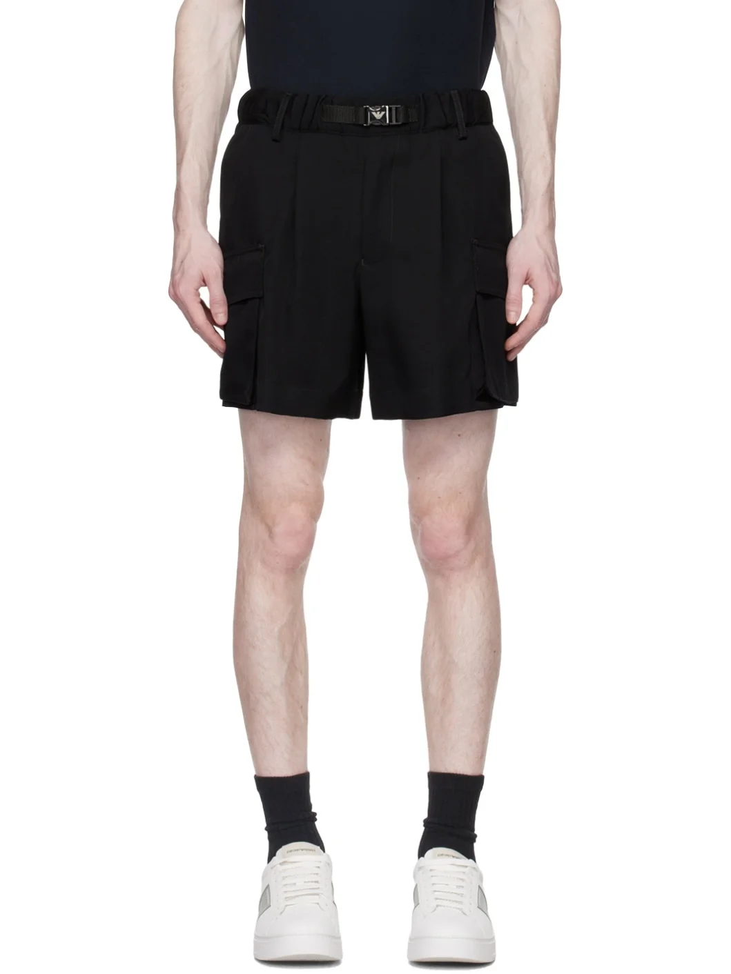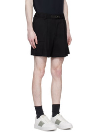 Wool gabardine shorts. · Elasticized waistband · Integrated grosgrain belt with press-release fastening · Four-pocket styling · Zip-fly · Pleats at front · Cargo pockets at outseams · Logo embroidered at back Supplier color: Nero 100% virgin wool. Made in Tunisia 231951M191014