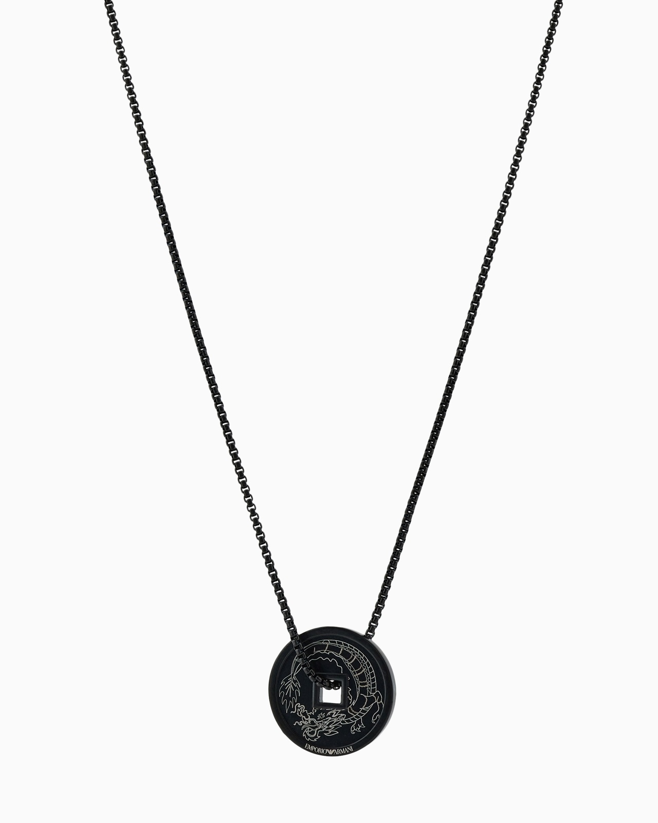 Pendant necklace features black stainless steel with lasered dragon motif and a lobster clasp closure. Necklace Pendant Stainless Steel Black Length: 525mm, Width: 23.6mm, Height: 23.6mm Product Code: EGS3045001NLPNLC
