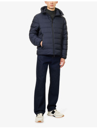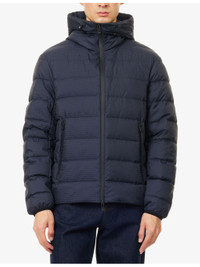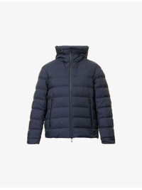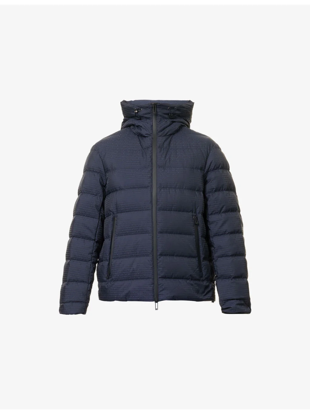 PRODUCT DETAILS - Emporio Armani shell-down jacket - 100% polyamide; filling 90% duck down, 10% duck feather; lining 100% polyamide - Concealed zip fastening at front - Regular fit, high-neck, drawstring hood, long sleeves, elasticated cuffs, two zip pockets at front, all-over brand print, all-over quilted and padded, fully lined, drawstring hem - Machine wash at 30°C - Size UK 40: length 26in / 66cm, chest 44in / 112cm - Model is 6ft 2in/1.88m and wears a size UK 40 - Lightweight, non-stretch Ref: R04537671