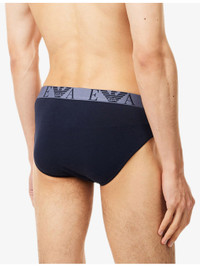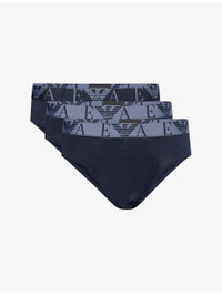 PRODUCT DETAILS - Emporio Armani pack of three stretch-cotton briefs - 95% cotton, 5% elastane; contrast 87% polyester, 13% elastane; lining 95% cotton, 5% elastane - Mid-rise, branded elasticated waistband, supportive panel at front - Machine wash at 30°C - Lightweight, stretchy - For hygiene reasons, we are unable to exchange or refund this product, unless faulty. Ref: R04544006