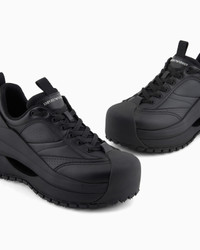 Chunky sneakers with leather uppers. Inspired by a futuristic and aerodynamic world in which the “shapeless” design of the sole combines with the technical nature and practicality of the upper. The shoe is completed by an EVA and TPU midsole and rubber tread. Leather upper Rounded toe Lace-up fastening Pull tab at the back Rubber soles Product Code: EM003035AF18226MC105