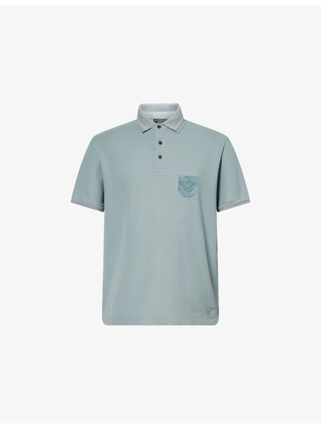PRODUCT DETAILS - Emporio Armani cotton polo shirt - 100% cotton - Exposed button fastenings at front - Relaxed fit, polo collar, three-button placket, short sleeves, logo crest embroidered at chest, braided ribbed trims - Machine wash at 30°C - Model is 6ft 2in/1.88m and wears a size medium - Lightweight, slight stretch Ref: R04556478