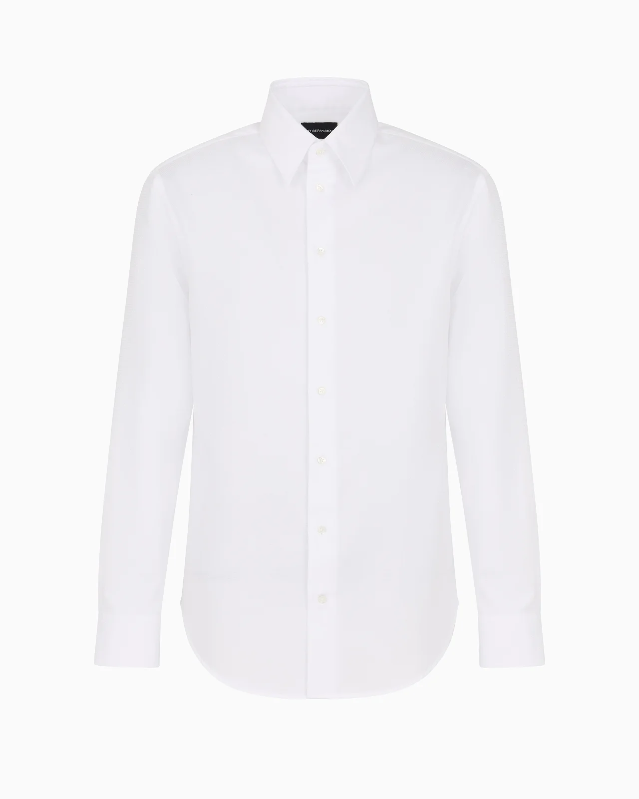 Pure cotton shirt with classic collar. The armure weave creates a two-tone micro-pattern that extends over the entire garment. Product Code: EM000194TE109551U0002 Details Composition 100% Cotton Armure weave Classic collar Front buttoning Long sleeves Rounded cuffs Back yoke Fitting The model is 188 cm tall and is wearing size 40