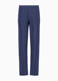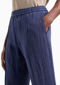 A garment whose essential design blends with the freshness of pure washed linen. The special quality of the linen that these trousers are made from is the exclusive finish with which the fabric is treated that gives it a crisp feel. This item’s classic lines are enhanced by a high-quality, light linen blend, automatically making it a must-have for the sunny season. Stretch-waist trousers with side pockets featuring central ribs on the front of the leg. Product Code: D41P59D14481920 Details Composition 100% Linen Plain weave Brand logo Solid color Drawstring closure High waisted Three pockets