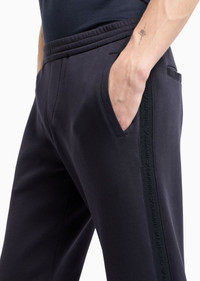 Double-jersey cotton-blend joggers with an internal drawstring and elasticated hem. The matching stripes on the sides stand out thanks to the high-relief embroidered logo lettering. Product Code: 6D1PK31JHSZ10920 Details Composition 76% Cotton 18% Polyester 6% Elastane Elasticated waist Inner drawstring Logo bands Side welt pockets Back welt pockets Elasticated hem Fitting The model is 188 cm tall and is wearing size 48/M (Italian Size)