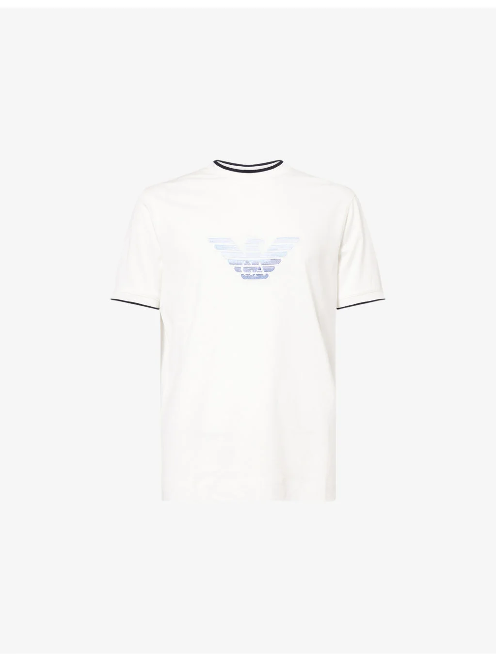 PRODUCT DETAILS - Emporio Armani woven T-shirt - 70% lyocell, 30% cotton - Regular fit, crewneck, short sleeves, gradient eagle embroidery at front, ribbed striped print - Machine wash at 30°C - Model is 6ft 2in/1.88m and wears a size medium - Lightweight, stretchy Ref: R04569264