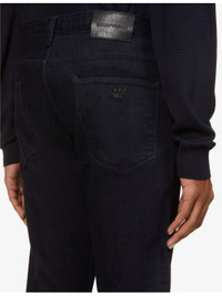 PRODUCT DETAILS - Emporio Armani stretch-denim jeans - 97% cotton, 3% elastane - Exposed button and zip-fly fastening at front - Slim fit, mid rise, tapered leg, belt loops, branded hardware, five pockets, branded plaque at front and back, branded patch at back, partially lined - Machine wash cold - Size UK 33: rise 10in / 26cm, inside leg 33in / 84cm, leg opening 14in / 36cm - Model is 6ft 2in/1.88m and wears a size UK 33 Ref: R03981620
