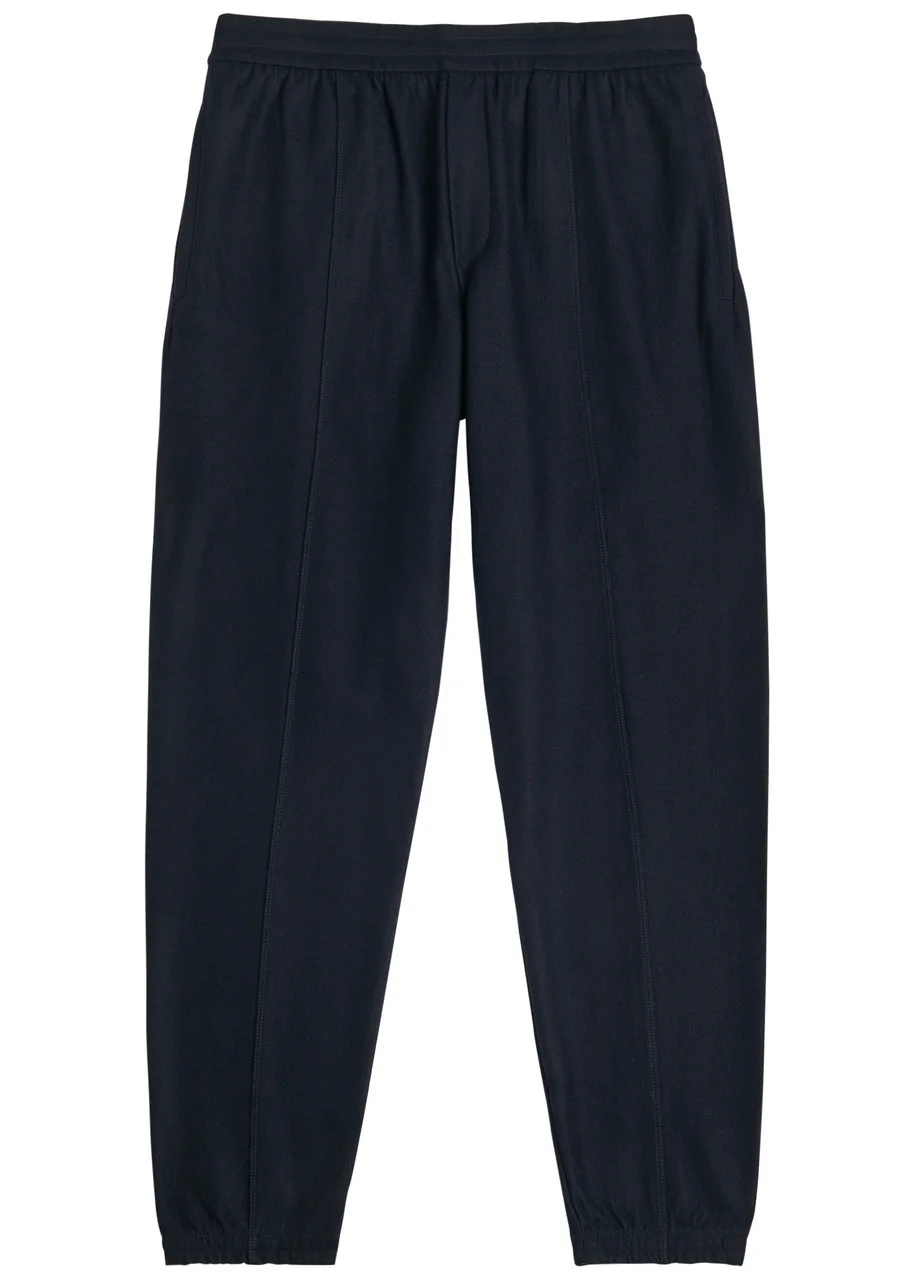 Info & Care Emporio Armani;wool trousers Concealed drawstring at elasticated waistband, faux fly, side slip pockets, seam through legs, designer plaque at back, back slit pockets, elasticated cuffs Pull on 100% virgin wool Dry clean Size & Fit Inside leg length: 30 inches/ 76.5cm Midweight Relaxed, tapered-leg cut Model is 6'1"/ 185cm and wears a size medium