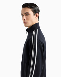 Full-zip sweatshirt made of modal-blend jersey with a special diagonal weave. The garment is characterised by contrasting stretch bands on side of the sleeves with an exclusive embossed logo in a jacquard weave. Jersey Diagonal weave Full zip Long sleeves Logo bands Side pockets Product Code: EM001110AF13488UB118