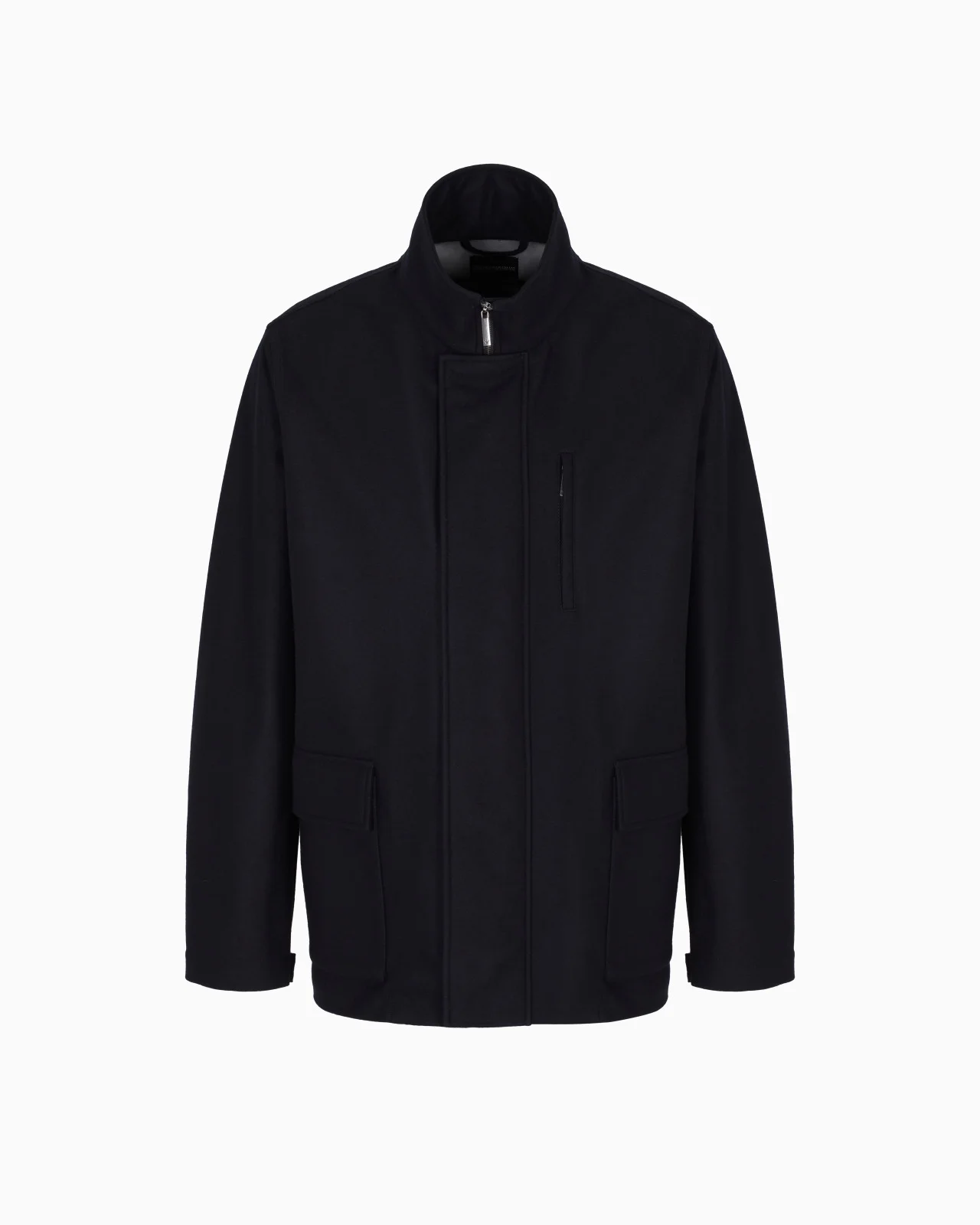 Pea coat with concealed full-zip fastening with press studs. Made of wool jersey bonded with a waterproof membrane: an outerwear piece designed for everyday commutes in the city that adapts to multiple occasions. Jersey Full zip with press studs Side patch pockets with a flap and press studs Long sleeves Product Code: EM003545AF18428U8139