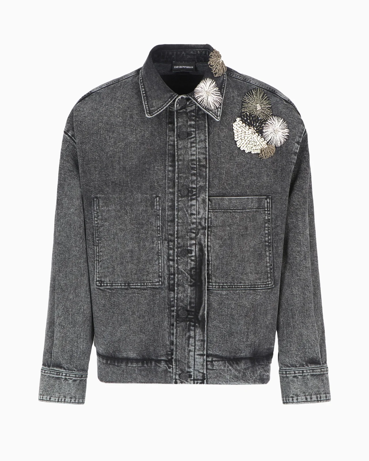 Classic-collar jacket made from garment-treated cotton denim. The metallic embroidery on the left side of the piece recalls the marine growth that accumulates on the keels of ships, a tribute to the uniting theme of the collection: the Atlantic. Denim reasserts itself in the Emporio Amani collections in increasingly urban shades such as grey, white and black, as well as classic blue. Denim Classic collar Front buttoning Denim-covered buttons Patch pocket on the chest Long sleeves Button cuffs Back yoke Product Code: 6D1B9W1DZ9Z0006