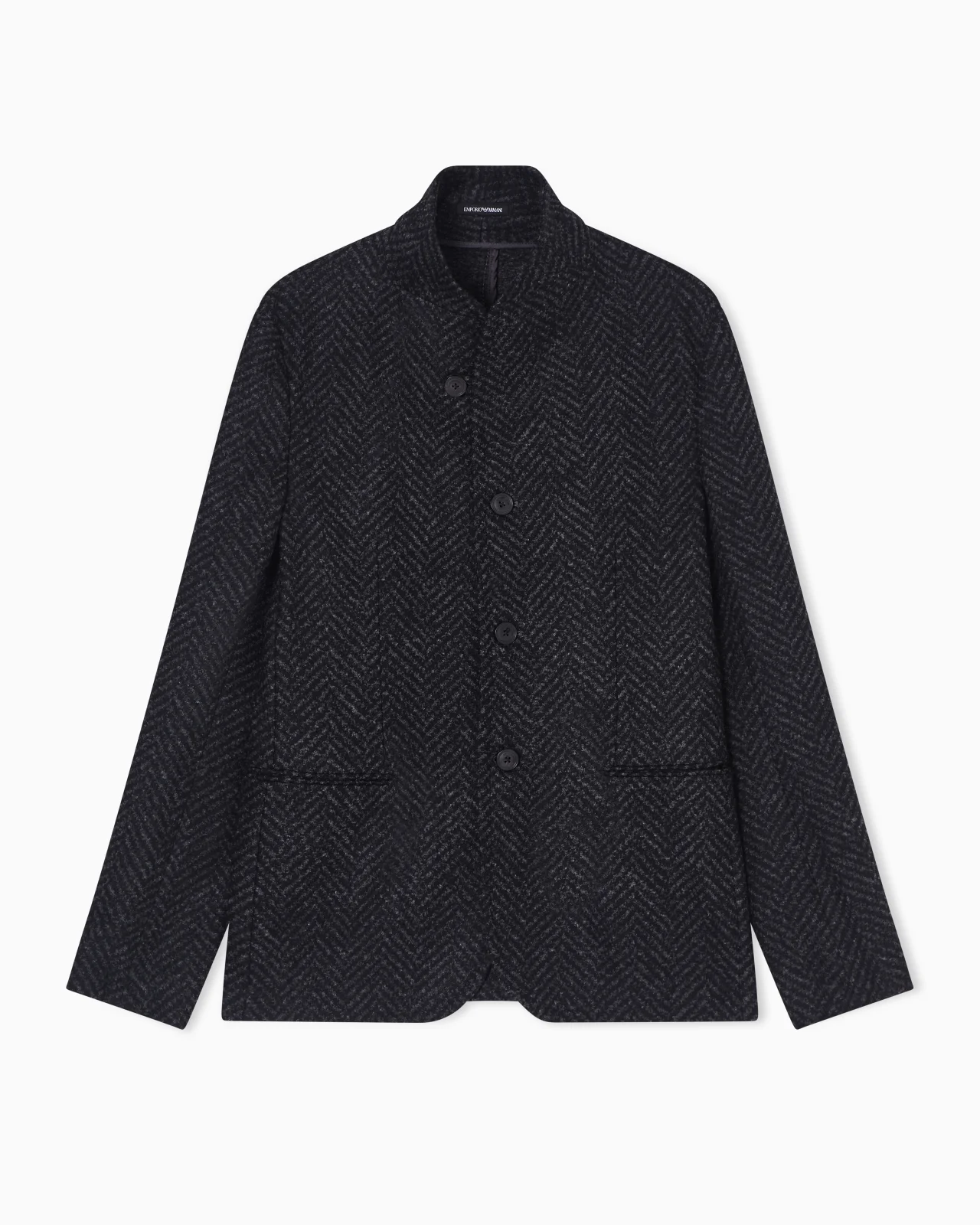 Jacket with a guru collar, made of wool blend jersey with an iconic all-over jacquard chevron motif enhancing the exclusivity of the garment. Jersey Jacquard Chevron motif Guru collar Front buttoning Double-welt side pockets Long sleeves Unlined garment Sleeves-only lined Product Code: EM000352TE19200FC018
