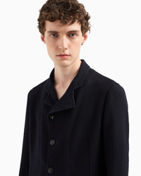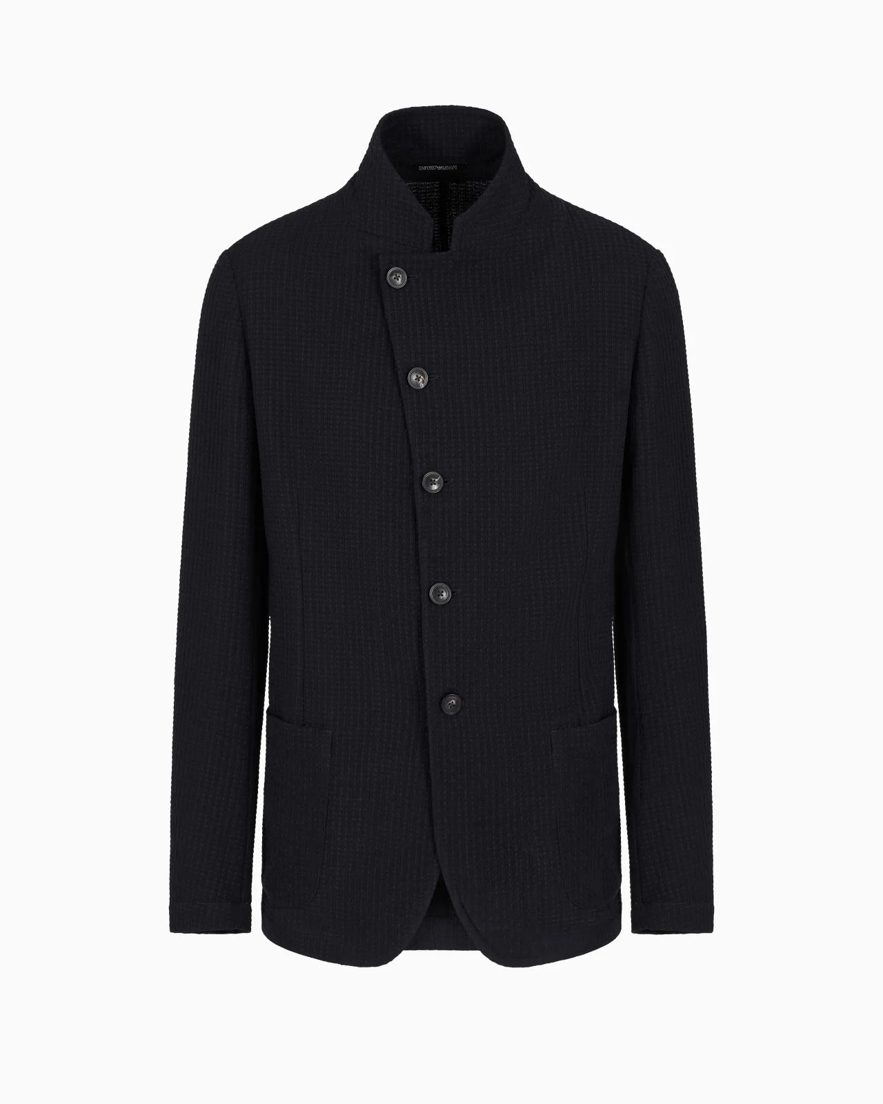 Jacket with a hallmark guru collar, off-centre button fastening and slim lapels at the neckline when not fully closed. Made of virgin wool, its unique armure weave creates a refined, all-over embossed motif. Armure weave Embossed motif Buttoned fastening Long sleeves Side patch pockets Unlined garment Product Code: EM000144TE12889UB081