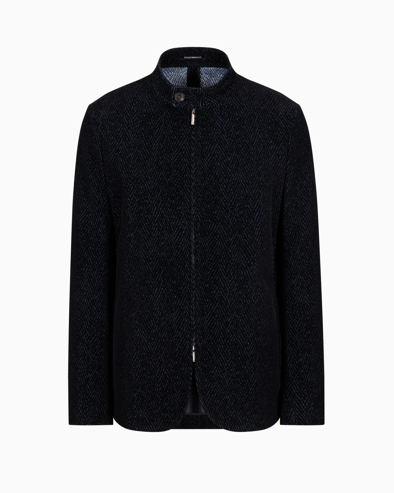 Jacket with guru collar and zip fastening, made of an exclusive thick, soft fabric. The mesh base is covered with a dense, all-over flock print with a chevron motif, creating a unique embossed surface with a velvety feel and compact texture. Product Code: EM000143TE111231U8113 Details Composition 77% Polyester 23% Elastane All-over flock print Chevron motif Guru collar with button Zip closure Long sleeves Side pockets with zip Unlined garment Fitting The model is 188 cm tall and is wearing size 48/M (Italian Size)