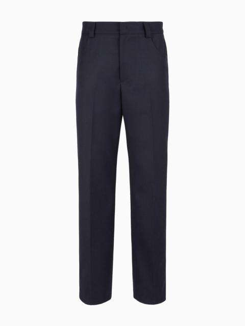 Trousers made of a heavy, compact virgin wool-blend gabardine with a typical diagonal twill weave. The texture drapes fluidly over the silhouette and creates a perfect fit. Product Code: EM000277TE112381U1113 Details Composition 55% Polyester 45% Virgin Wool Compact gabardine Waist with belt loops Zip, hook and button closure Side pockets Back patch pockets Fitting The model is 188 cm tall and is wearing size 48/M (Italian Size)