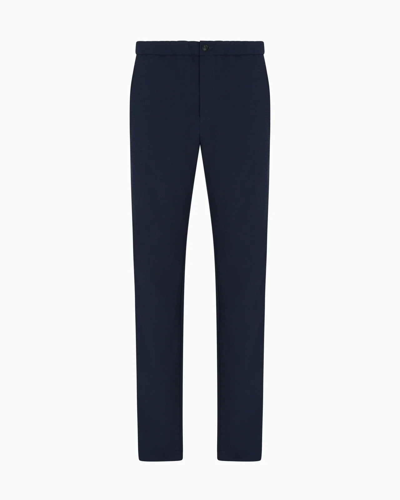 Trousers with an elasticated back waistband, made from micro-textured crepe jersey with a unique embossed 3D pique effect, and with a particularly fluid and lightweight look. The Icon capsule collection is dedicated to the Emporio Armani man and celebrates, season after season, the versatility and timeless elegance of the brand, reworking iconic clothing with a modern twist, in a perfect harmony of tradition and innovation. The FW25 selection is initially defined by fluid and airy silhouettes that play on blue and camel tones, then continues with a focus on exclusive knitwear distinguished by graphic designs and patterns with a strong visual impact. Crepe jersey Micro-textured weave Waist with elastic back Zip and button closure Side pockets with zip Back welt pockets Product Code: EM001611TE14101UB081