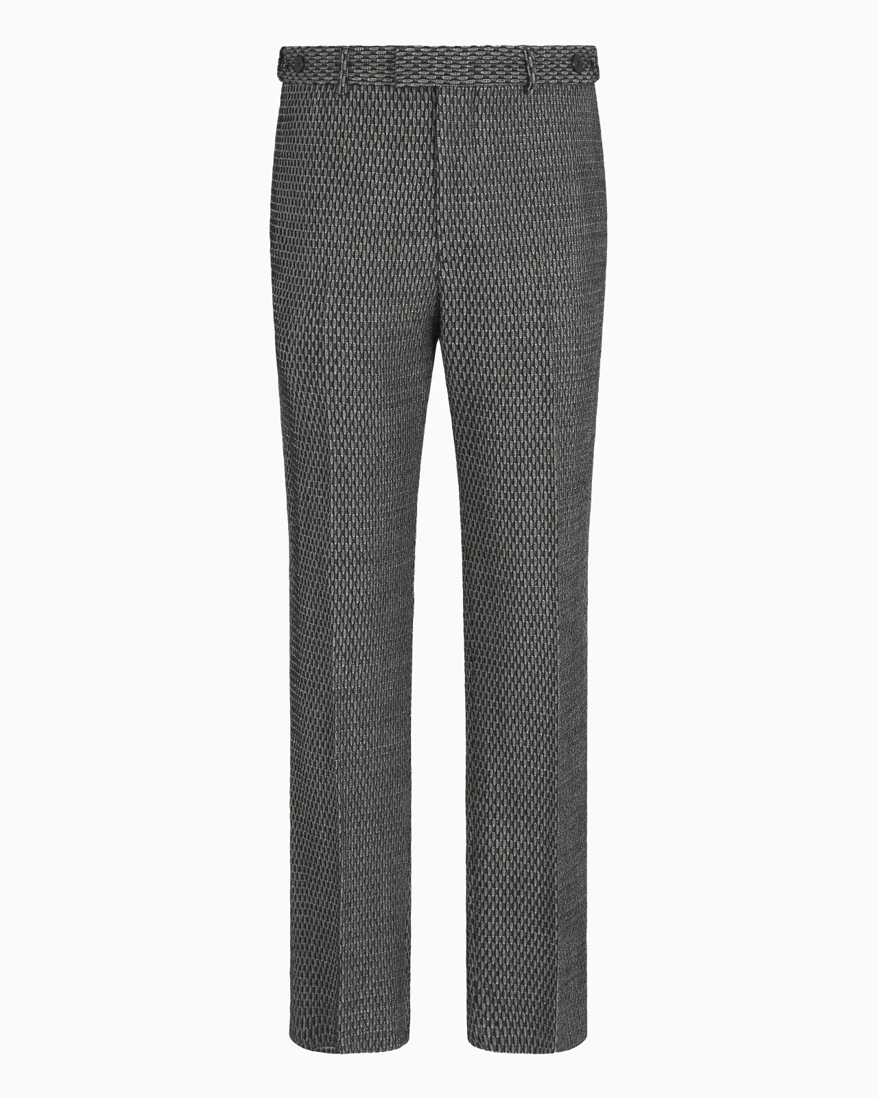 Trousers with a faux waist-adjuster detail with button on the sides, made of a very fresh-texture virgin wool featuring a distinctive armure weave that recreates an refined all-over motif. The Icon capsule collection dedicated to the Emporio Armani man is revived for the SS25 season: the result is a selection of the most iconic pieces in the collection that affirm the Emporio Armani heritage. The colour palette is typically Armani, with essential navy blue paired with white and a series of natural shades ranging from greige to nut-brown. Emporio Armani’s DNA achieves its finest expression in sophisticated and comfortable total looks, thanks to soft textures, tactile patterns and fluid silhouettes. Knit Armure weave Buttoned waist-adjuster strap Zip, hook and button closure Side inseam pockets Back double welt pocket Product Code: EM000275TE13909FC030