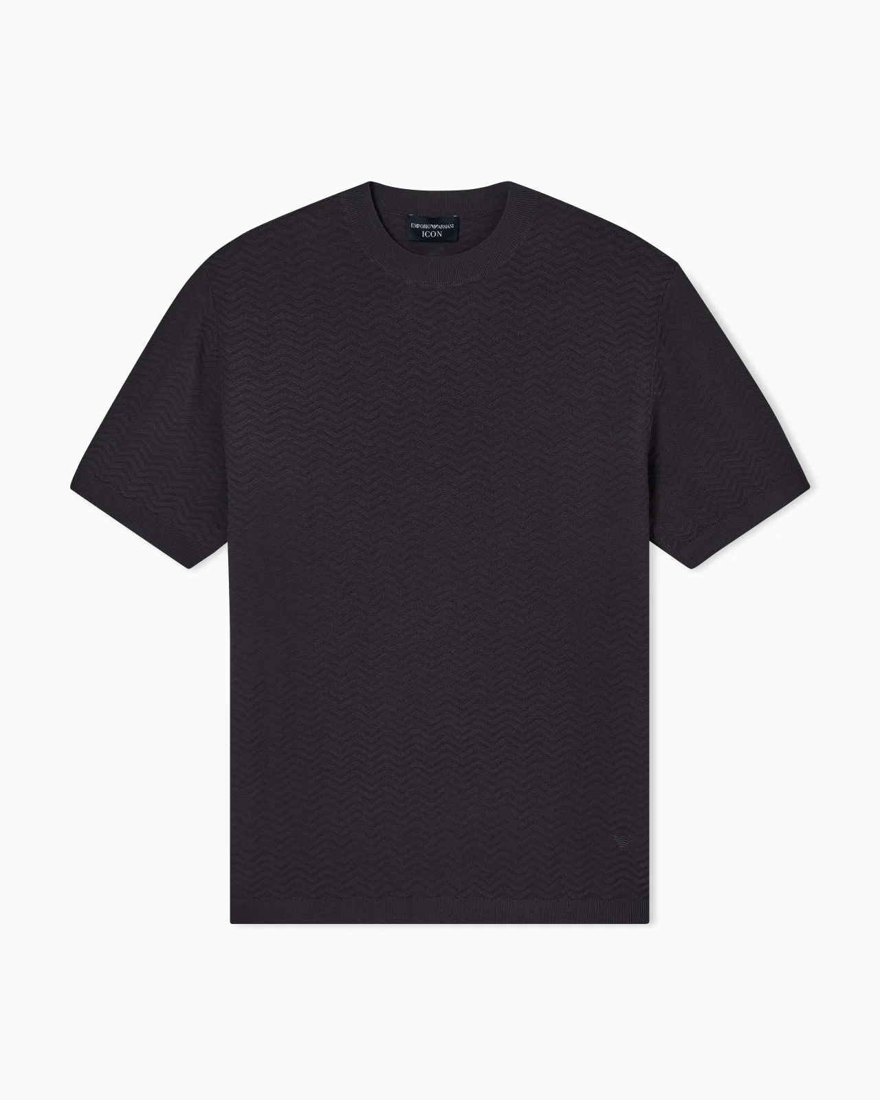 Crew-neck, short-sleeved jumper featuring an exclusive raised stitch design that creates the iconic all-over chevron pattern. The garment is part of the Icon capsule collection. Fabric: 85% viscose from responsible forestry Fineness: 16 Knit Chevron stitch Crew neck Long sleeves Rib-knit cuffs and hem Product Code: EM004671AF23759U8168