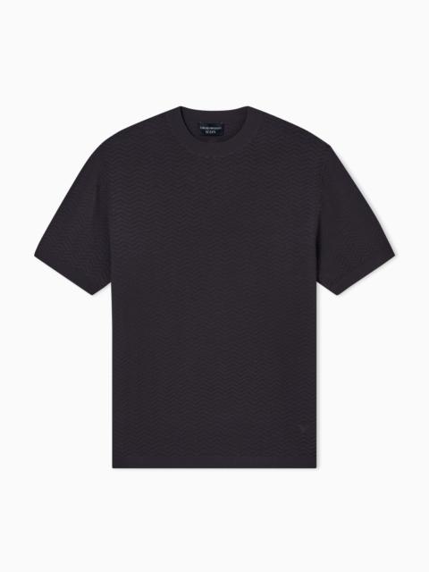 Crew-neck, short-sleeved jumper featuring an exclusive raised stitch design that creates the iconic all-over chevron pattern. The garment is part of the Icon capsule collection. Fabric: 85% viscose from responsible forestry Fineness: 16 Knit Chevron stitch Crew neck Long sleeves Rib-knit cuffs and hem Product Code: EM004671AF23759U1146