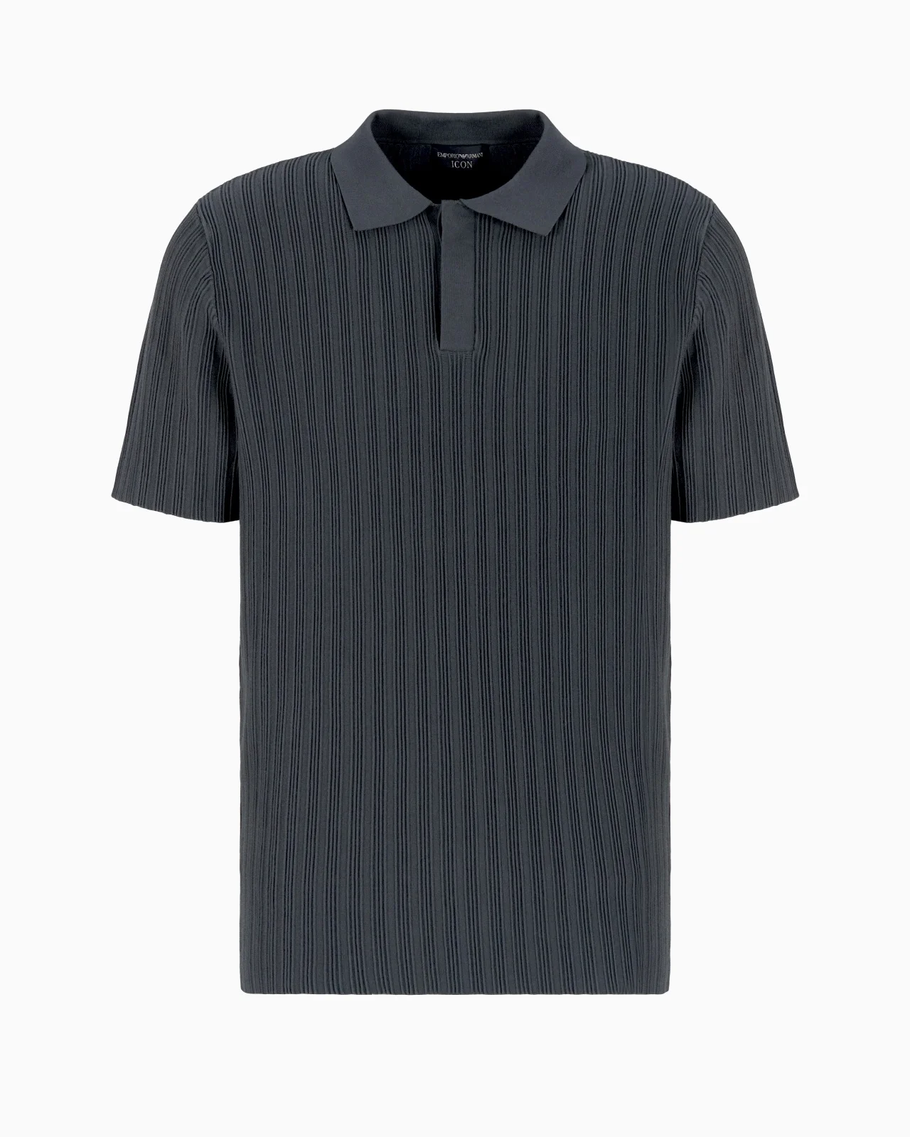 Polo-neck jumper featuring an ottoman knit with a traditional embossed rib-effect motif. The Icon capsule collection dedicated to the Emporio Armani man is revived for the SS25 season: the result is a selection of the most iconic pieces in the collection that affirm the Emporio Armani heritage. The colour palette is typically Armani, with essential navy blue paired with white and a series of natural shades ranging from greige to nut-brown. Emporio Armani’s DNA achieves its finest expression in sophisticated and comfortable total looks, thanks to soft textures, tactile patterns and fluid silhouettes. Fineness: 16 Ottoman-stitch knit Polo-shirt collar Concealed partial buttoning Short sleeves Product Code: EM000636AF14128U8165